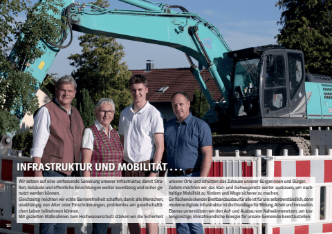 Wir setzen auf eine umfassende Sanierung unserer Infrastruktur, damit Straßen, Gebäude und öffentliche Einrichtungen weiter zuverlässig und sicher genutzt werden können. Gleichzeitig möchten wir echte Barrierefreiheit schaffen, damit alle Menschen,unabhängig von Alter oder Einschränkungen, problemlos am gesellschaftlichen Leben teilnehmen können.Mit gezielten Maßnahmen zum Hochwasserschutz stärken wir die Sicherheitunserer Orte und schützen das Zuhause unserer Bürgerinnen und Bürger.Zudem möchten wir das Rad- und Gehwegenetz weiter ausbauen, um nachhaltige Mobilität zu fördern und Wege sicherer zu machen.Ein flächendeckender Breitbandausbau für alle ist für uns selbstverständlich, dennmoderne digitale Infrastruktur ist die Grundlage für Bildung, Arbeit und Innovation. Ebenso unterstützen wir den Auf- und Ausbau von Nahwärmenetzen, um kostengünstige, klimafreundliche Energie für unsere Gemeinde bereitzustellen.INFRASTRUKTUR UND MOBILITÄT . . .10Bel-CSU_2026_Layout 1 05.02.2026 19:19 Seite 10