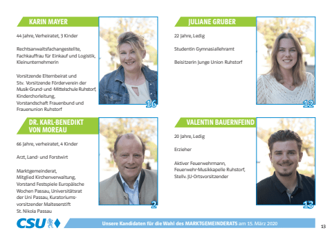 1312JULIANE GRUBER22 Jahre, LedigStudentin Gymnasiallehramt Beisitzerin Junge Union RuhstorfKARIN MAYER44 Jahre, Verheiratet, 3 KinderRechtsanwaltsfachangestellte, Fachkauffrau für Einkauf und Logistik,KleinunternehmerinVorsitzende Elternbeirat und Stv. Vorsitzende Förderverein der Musik-Grund- und -Mittelschule Ruhstorf,Kinderchorleitung, Vorstandschaft Frauenbund und Frauenunion Ruhstorf16VALENTIN BAUERNFEIND20 Jahre, LedigErzieherAktiver Feuerwehrmann, Feuerwehr-Musikkapelle Ruhstorf,Stellv. JU-Ortsvorsitzender 13Unsere Kandidaten für die Wahl des MARKTGEMEINDERATS am 15. März 20202DR. KARL-BENEDIKT VON MOREAU66 Jahre, verheiratet, 4 KinderArzt, Land- und ForstwirtMarktgemeinderat, Mitglied Kirchenverwaltung, Vorstand Festspiele EuropäischeWochen Passau, Universitätsratder Uni Passau, Kuratoriumsvorsitzender Malteserstift St. Nikola PassauBel-CSU_2026_Layout 1 05.02.2026 19:19 Seite 13