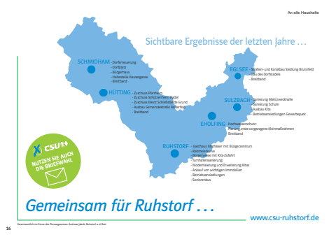 16Verantwortlich im Sinne des Pressegesetzes: Andreas Jakob, Ruhstorf a. d. Rottwww.csu-ruhstorf.deAn alle HaushalteSCHMIDHAMHÜTTINGRUHSTORFEHOLFINGSULZBACHEGLSEE- Dorferneuerung - Dorfplatz- Bürgerhaus- Haltestelle Hausergasse- Breitband- Zuschuss Pfarrheim- Zuschuss Schützenheim Hader- Zuschuss Elektr. Schießstände Grund- Ausbau Gemeindestraße Reiserfeld- Breitband- Gasthaus Mathäser mit Bürgerzentrum- Reitmeierkurve- Bürgerwiese mit Kita-Zufahrt- Turnhallensanierung- Modernisierung und Erweiterung Kitas- Ankauf von wichtigen Immobilien- Betriebsansiedlungen- Seniorenbus- Hochwasserschutz: Planung, erste vorgezogene Kleinmaßnahmen- Breitband- Sanierung Mehrzweckhalle- Sanierung Schule - Ausbau Kita- Betriebsansiedlungen Gewerbepark- Straßen- und Kanalbau Siedlung Brunnfeld- Bau des Dorfstadels- BreitbandSichtbare Ergebnisse der letzten Jahre . . .NUTZEN SIE AUCH DIE BRIEFWAHL7Ortsverband Ruhstorf an der RottGemeinsam für Ruhstorf . . .Bel-CSU_2026_Layout 1 05.02.2026 19:19 Seite 16